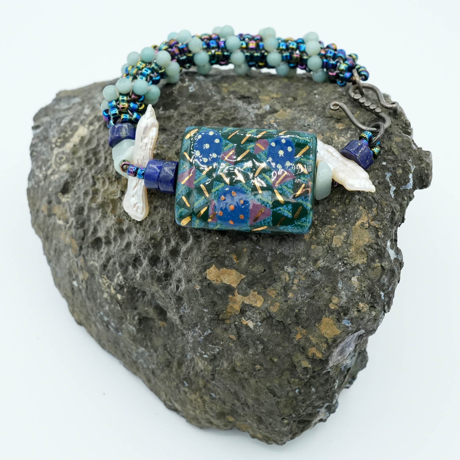 Tubular peyote woven bracelet with aquamarine gemstones and glass seed beads; porcelain bead focal; freshwater pearls; sterling silver clasp. Size:7.5
