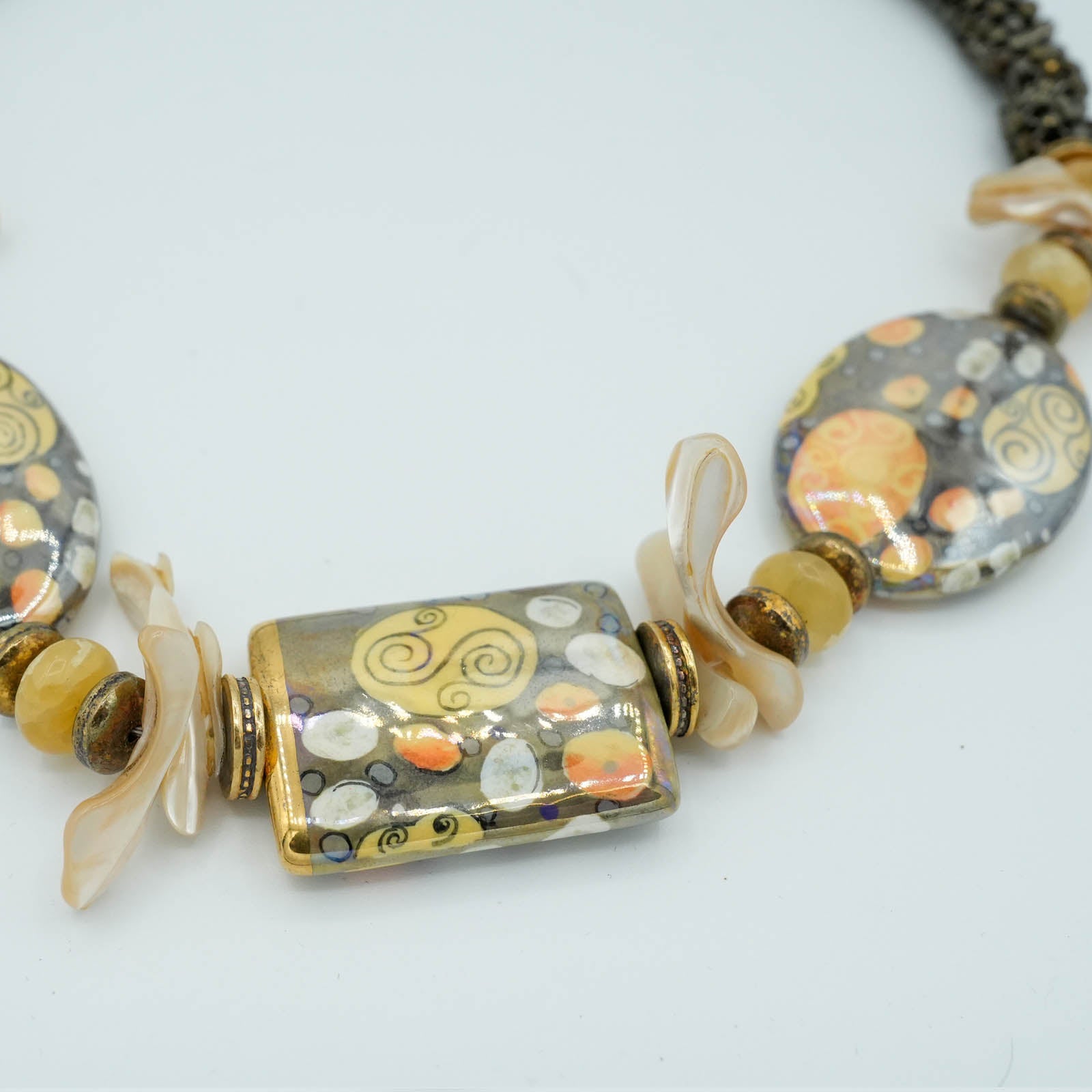 Gold Porcelain Beads and Freshwater Pearls with Tubular Peyote Seed Bead Chain